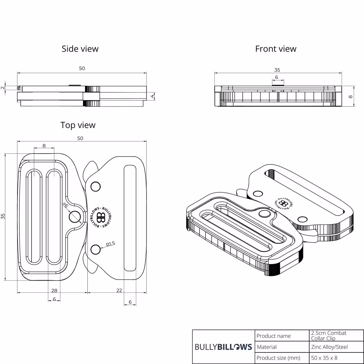 Det originale BullyBillows 2,5 cm Combat Collar er det første i sitt slag i verden. Halsbåndet er laget med trippelsydd nylon, en solid 4 mm bred D-ring i aluminiumslegering, og en spesialdesignet hurtigspenne som både kan låses og åpnes raskt.