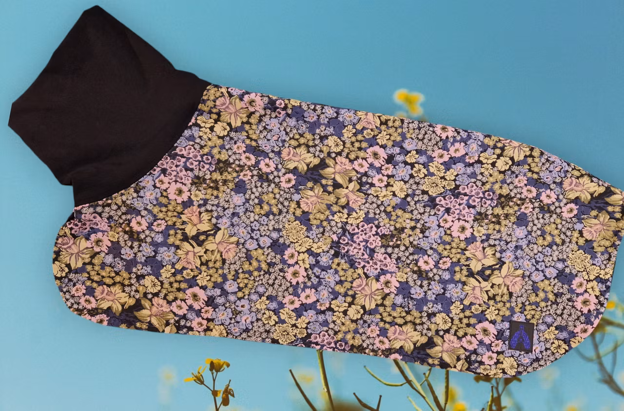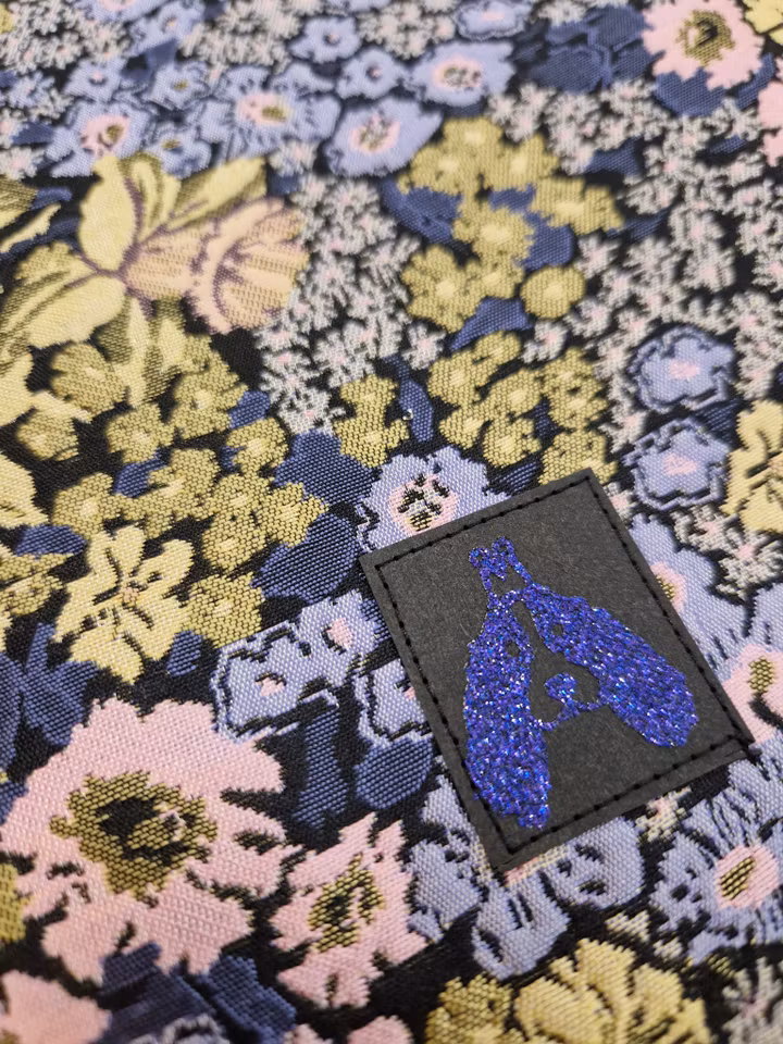 Silkedekken sdydd i lekkert blomstret brokadestoff, lilla, rosa og grønne blomster på sort bunn. Dekkenet er medium tungt og vil nok passe til de fleste springer pelser :)