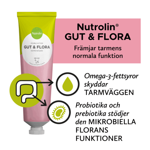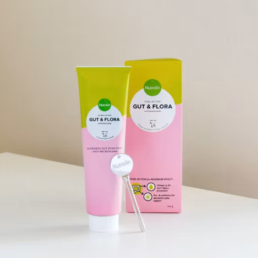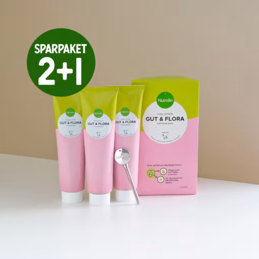 Nutrolin® GUT & FLORA er en unik kombinasjon av næringsstoffer som fremmer god tarmhelse: fiskeolje, probiotika og prebiotika.