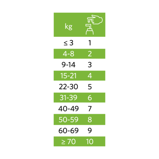 Daglig dosering gis sammen med hundens fôr eller separat. Ett trykk på pumpen gir 2 ml.