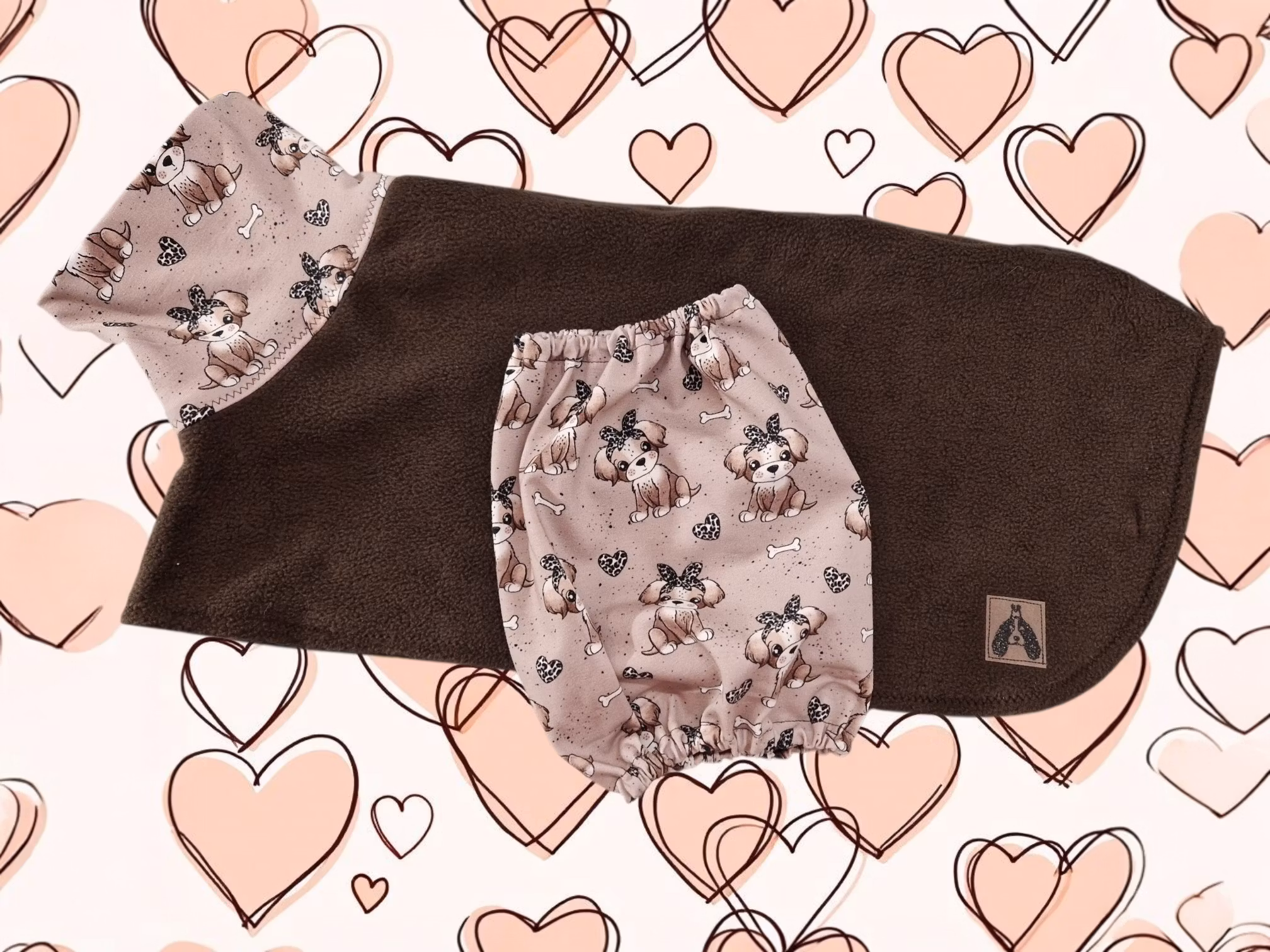 Deilig fleece tørke/varmedekken sydd i mørk brun polarfleece, søte valper på halsen. Foret med teknisk stoff som transporterer fuktighet ut av pelsen.