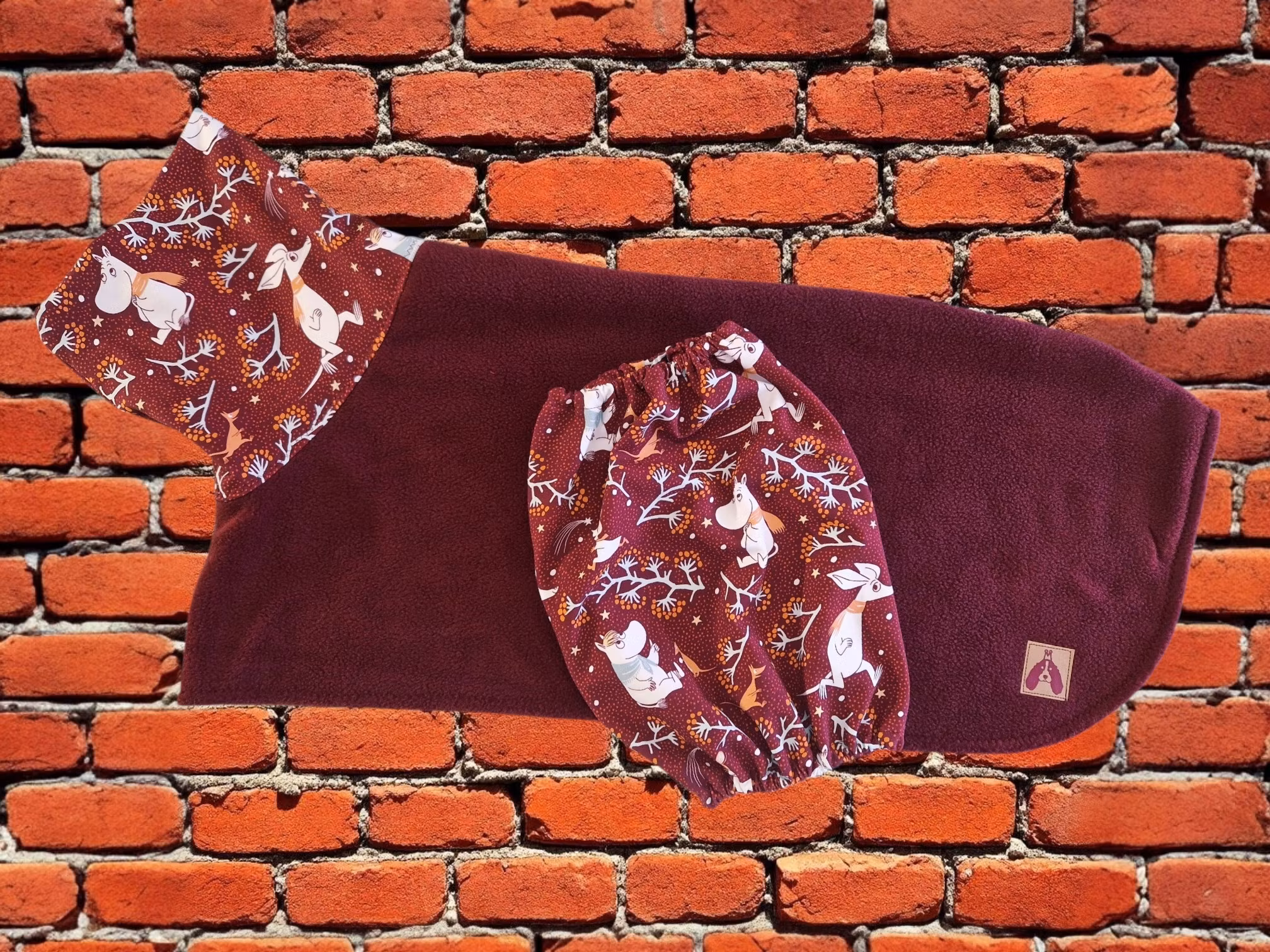 Deilig fleece tørke/varmedekken sydd i mørk plommefarget polarfleece, med hærlige Mummidalen på halsen. Foret med teknisk stoff som transporterer fuktighet ut av pelsen.