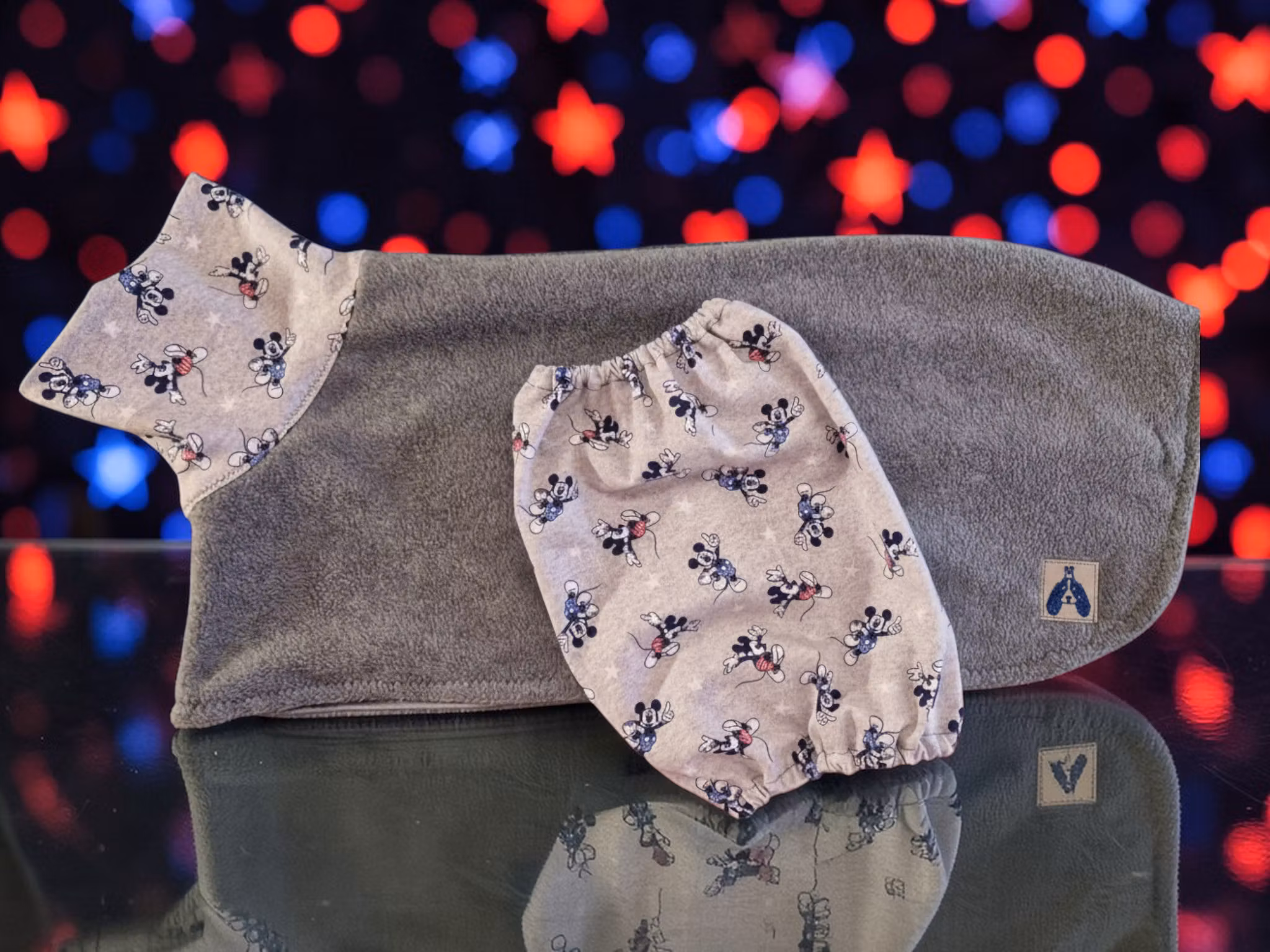 Deilig fleece tørke/varmedekken sydd i grå polarfleece, med søte Mikke Mus på halsen. Foret med teknisk stoff som transporterer fuktighet ut av pelsen.