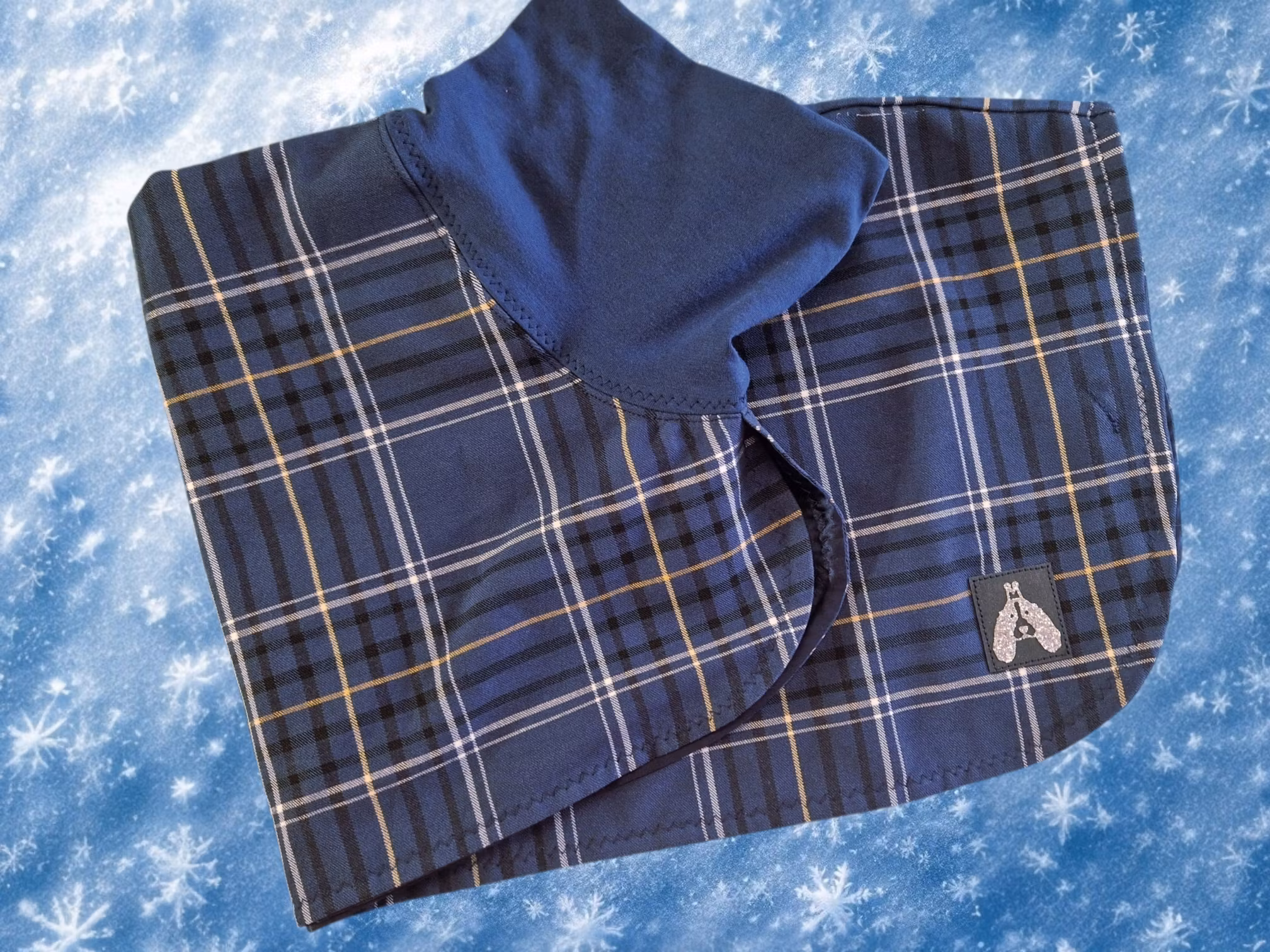 Silkedekken sydd i et denimblått klassisk rutet gabardinstoff m/stretch. Kjempegod kvalitet med god tyngde, så dette får orden på de fleste pelskvaliteter. Dette dekkenet tåler omtrent allverdens av aktive Cocker gutter. Supersterkt stoff.