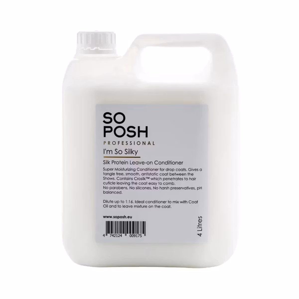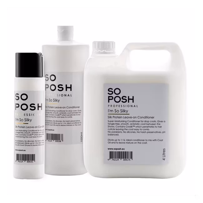 So Posh I'm So Silky Leave-On Balsam - formulert for drop-coats. Leave-on balsame som er beriket med silkeprotein, den etterlater pelsen lett å børste gjennom, ekstremt skinnende og reduserer floker betydelig. Ikke bare får den pelsen til å se og føles fantastisk ut, men den hjelper også med å fornye hårveksten med sine ekstreme fuktbindende egenskaper, og etterlater din pelskledde venn med en vakker og frodig pels.