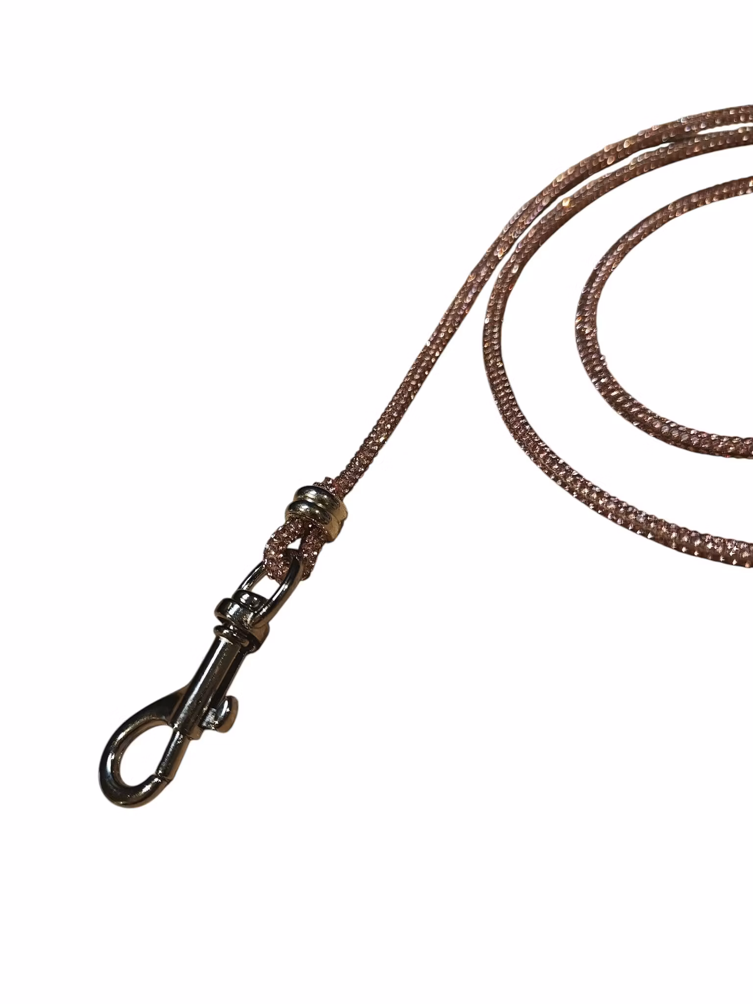 Lekkert håndlaget glitrende rosafarget utstillingslenke som virkelig glitrer om kapp med solen. 3mm tykk, sølvfarget krok. Leiehåndtak. Passer til miniatyr/liten hund.